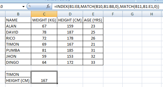 I have put the formula =INDEX(B1:E8,MATCH(B10,B1:B8,0),MATCH(B11,B1:E1,0))