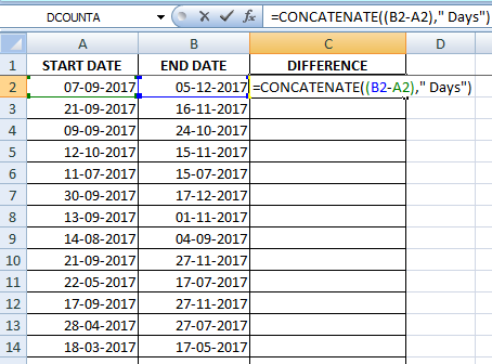 e. Put just =B2-A2 to calculate the difference and it will show “Days” after the formula result automatically.